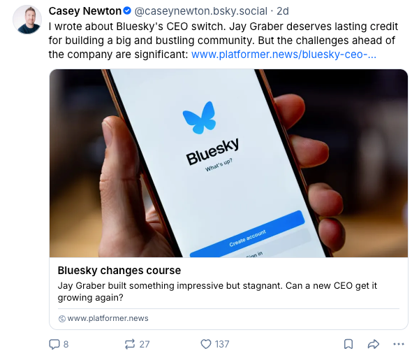 Par exemple, ke journaliste de tech Casey Newton (fondateur de Platformer) a plus que 250 000 abonnés sur Bluesky. Et pourtant, il a souvent très peu de repartages et de commentaires sur ses publications.