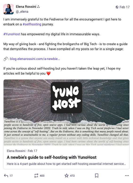 Imaginez toutes les opportunités : rendre le Fédivers un véritable moyen public qui permet de réaliser la promesse originelle de l'internet, celle de relier les gens et servir leurs intérêts... Une promesse dépourvue d'impératifs commerciaux.