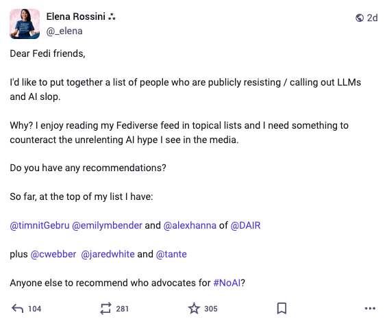 Je ne pense pas pouvoir rendre justice à l'article originel dans cette traduction. Vous pouvez le lire ici : https://blog.elenarossini.com/openness-transparency-and-reach-three-reasons-why-public-institutions-should-embrace-the-fediverse/. Je reprend l'article à la première personne, mais ce n'est évidemment pas moi qui l'ai écrit ou qui fait preuve de son propos.