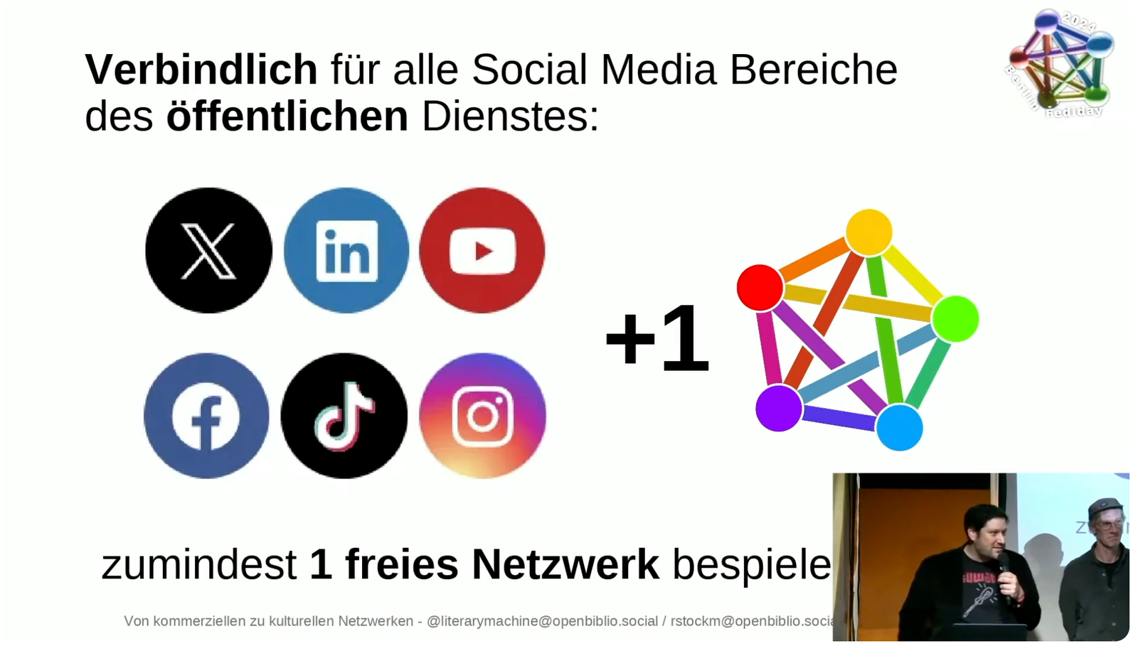 Il n'existe pas une seule réponse à cette question. Ralf Stockmann, directeur du développement numérique et du réseautage d'affaires à ZLB (Zentral- und Landesbibliothek Berlin, ou Bibliothèque centrale et d'État de Berlin) a proposé une stratégie « +1 » de communications pour les institutions publiques pendant une présentation à la Journée berlinois du Fédivers en 2024 (vidéo).