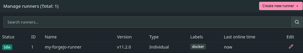 ssh -o StrictHostKeyChecking=no -i .ssh/runner_key runner@localhost 'systemctl --user enable --now forgejo-runner'You should now see from forgejo that your runner is properly signed in.