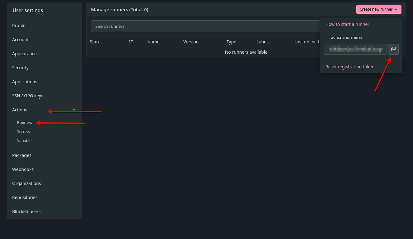 Created symlink '/home/runner/.config/systemd/user/default.target.wants/podman.service' → '/usr/lib/systemd/user/podman.service'.Now onto registering the forgejo-runner. Generate the registration token associated to your user, forgejo instance or organization (it really depends on your use-case here, who should have access to this runner).